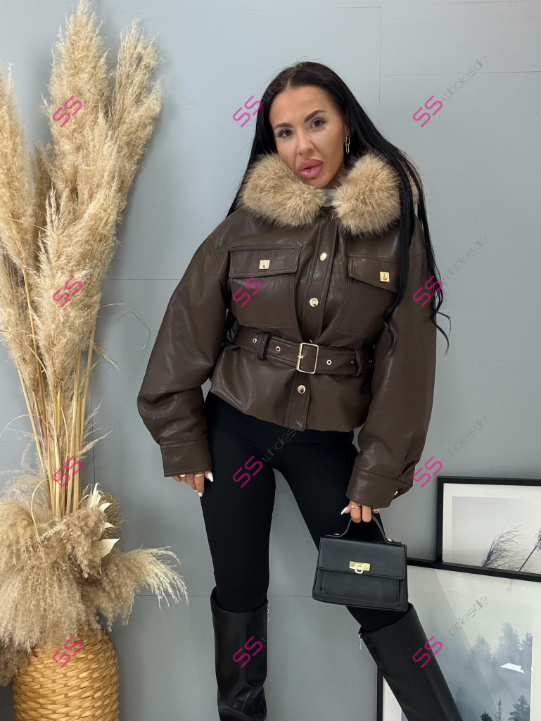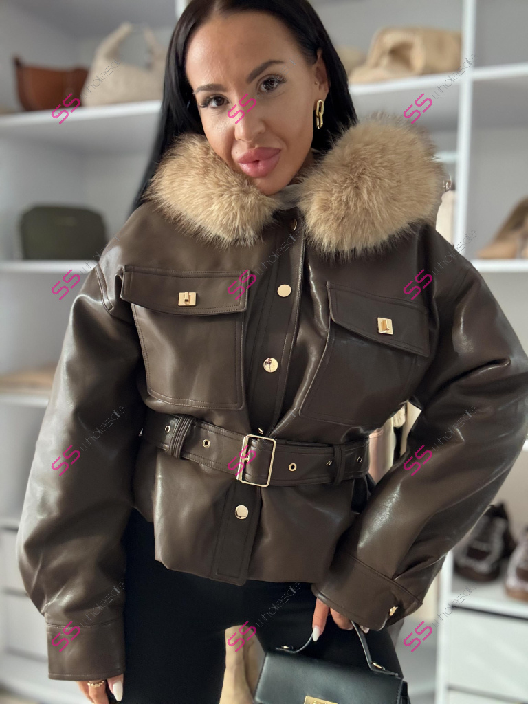 Kožená bunda s odnímateľným kožušinovým lemom na golieri. Podšitý mäkkým, príjemným kožúškom. Detaily sú v zlatej farbe. S vreckami v prednej časti. S opaskom.