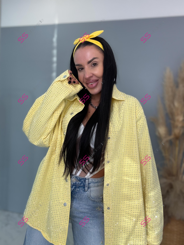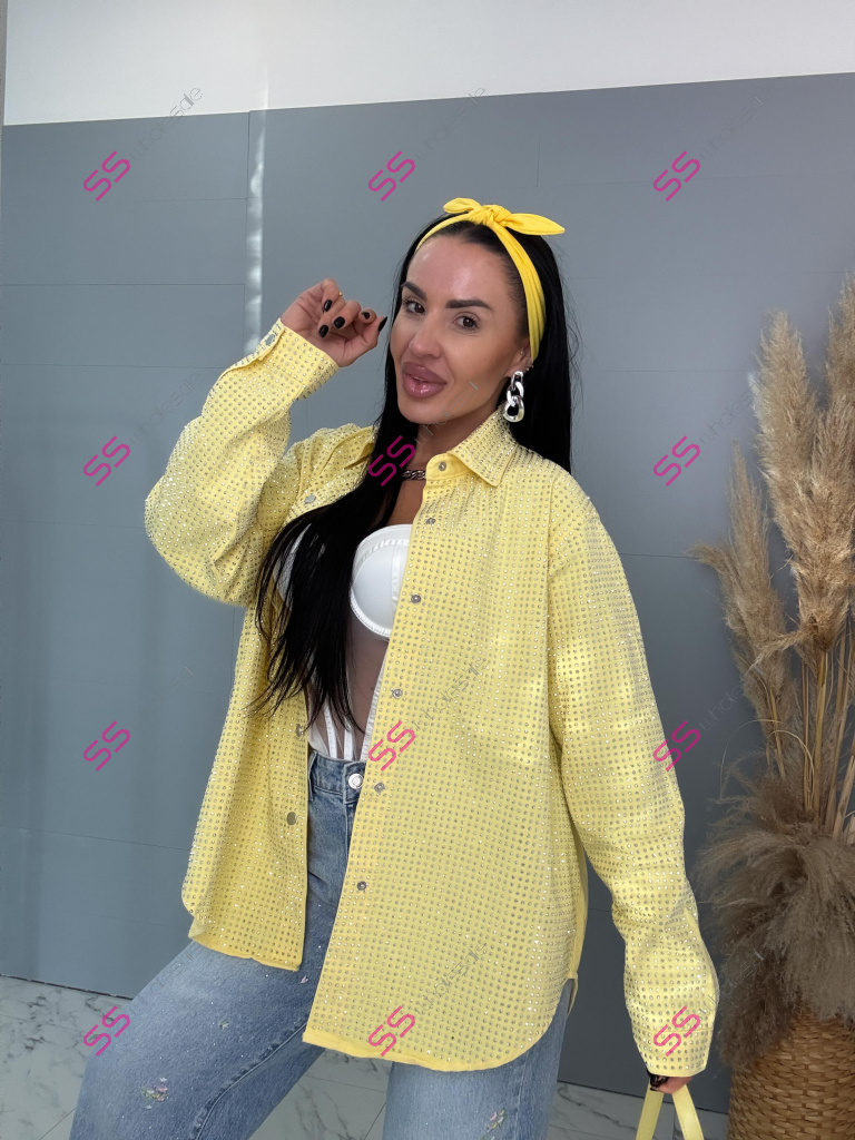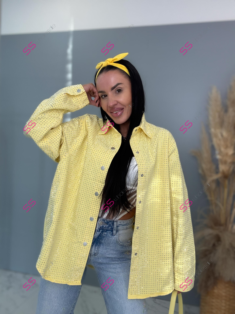 Dámska denim košeľa s ozdobnými kamienkami. Materiál nie je elastický. Zapínania na spony sú striebornej farby.