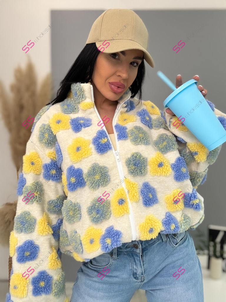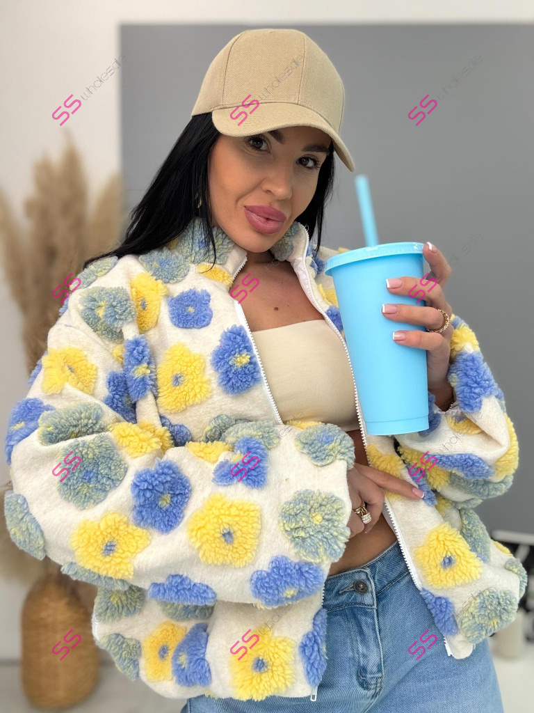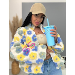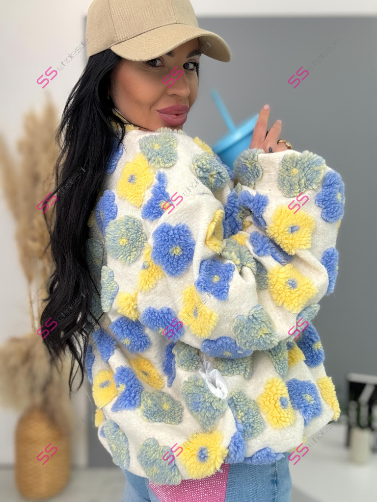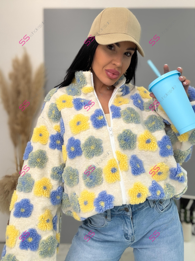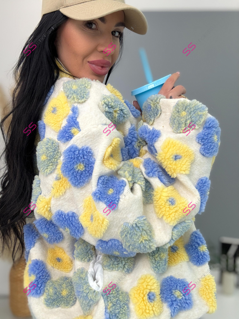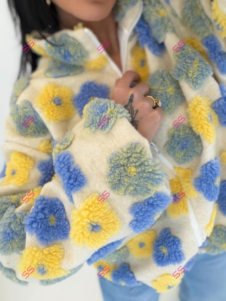 Kabát je vyrobený z príjemného materiálu. Model vyniká plyšovými aplikáciami v tvare kvetu. Oversize prevedenie so stojačikom a podšívkou. Zapína sa na zips. Bočnými vreckami.