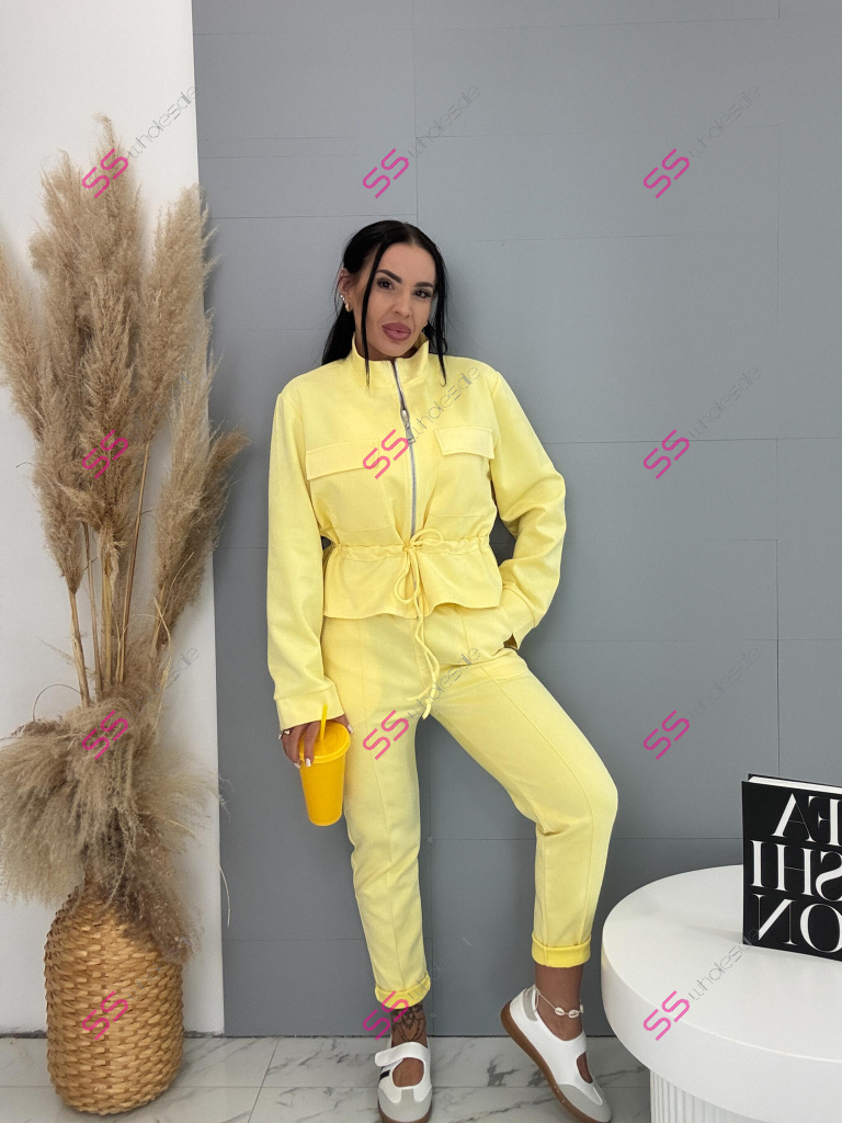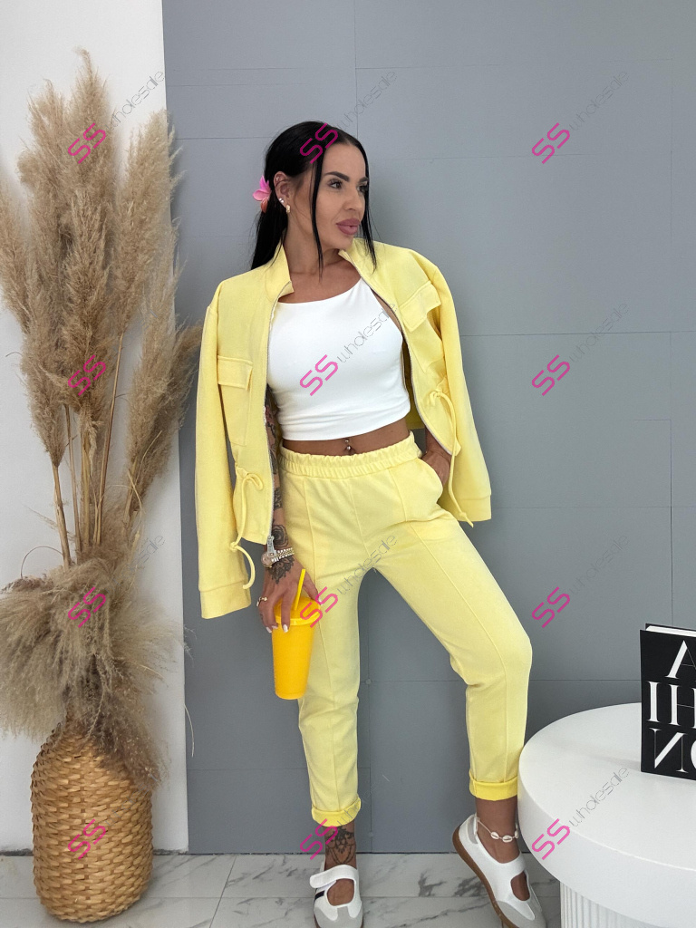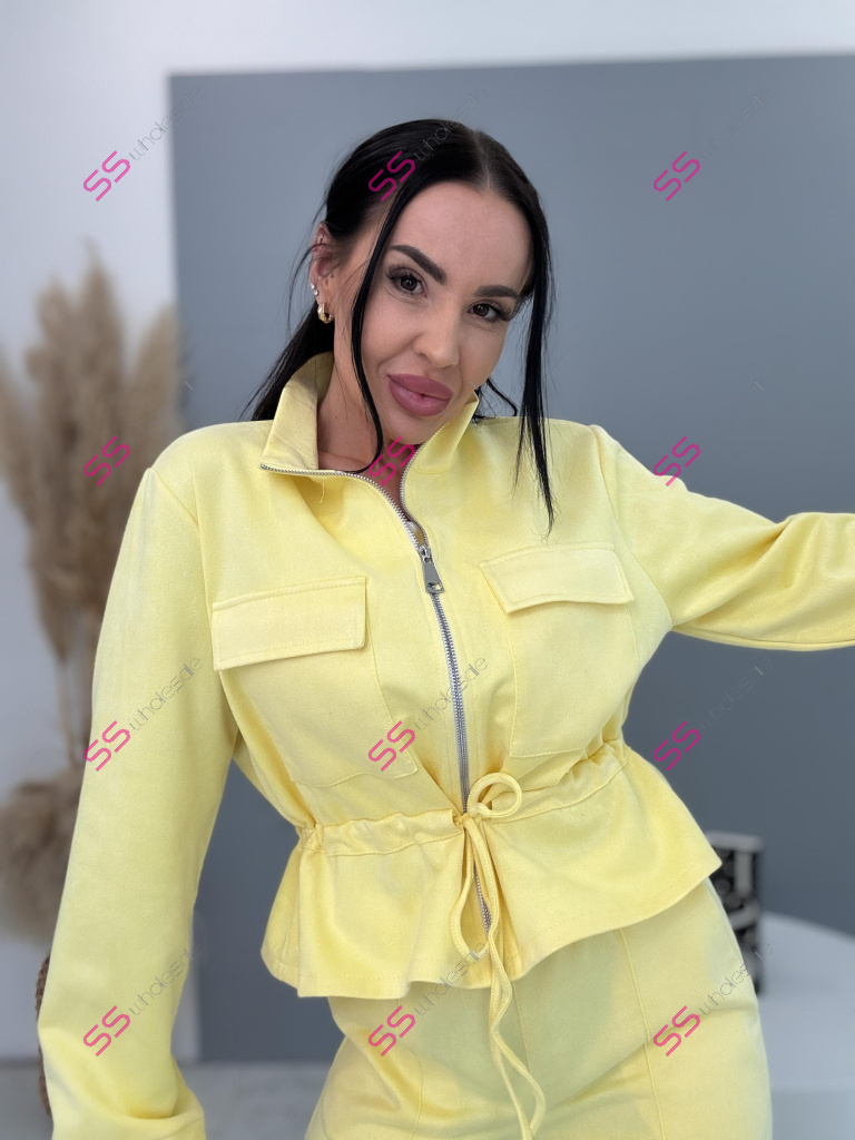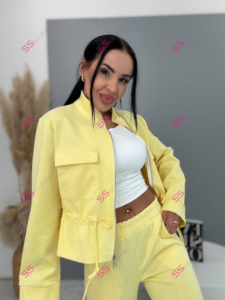 Dámský komplet z novej kolekcie. Pozostáva z mikiny so zipsom a nohavíc. Materiál je príjemný, elastický. Nohavice s gumeným pásom a bočnými vreckami. Mikina s prednými vreckami a viazaním v páse.